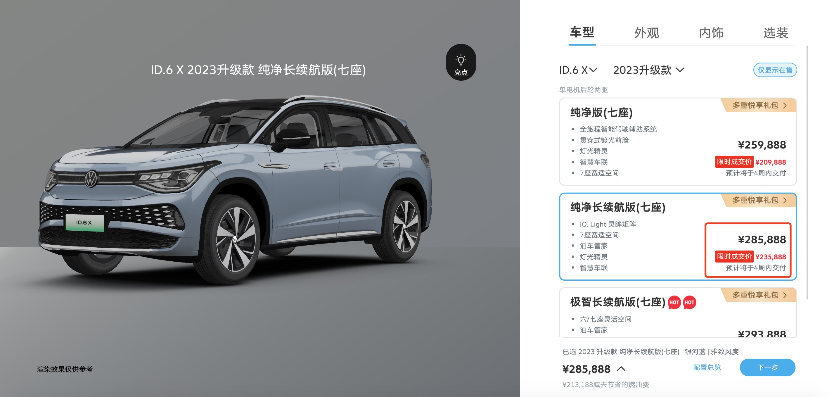 動(dòng)力續(xù)航上,ID.6 X提供多種性能、續(xù)航版本,主銷車型配備寧德時(shí)代三元鋰電池,容量為83.4千瓦時(shí),支持0.67小時(shí)快充,最高續(xù)航617公里。同樣,作為ID.家族旗艦級(jí)SUV,上汽大眾為ID.6 X推出限時(shí)優(yōu)惠,綜合優(yōu)惠至高5萬元。從官網(wǎng)顯示,ID.6 X長續(xù)航版指導(dǎo)價(jià)28.5888萬元,限時(shí)優(yōu)惠價(jià)格23.5888萬元,25萬元落地一款6座純電中大型SUV,是不是很誘人?