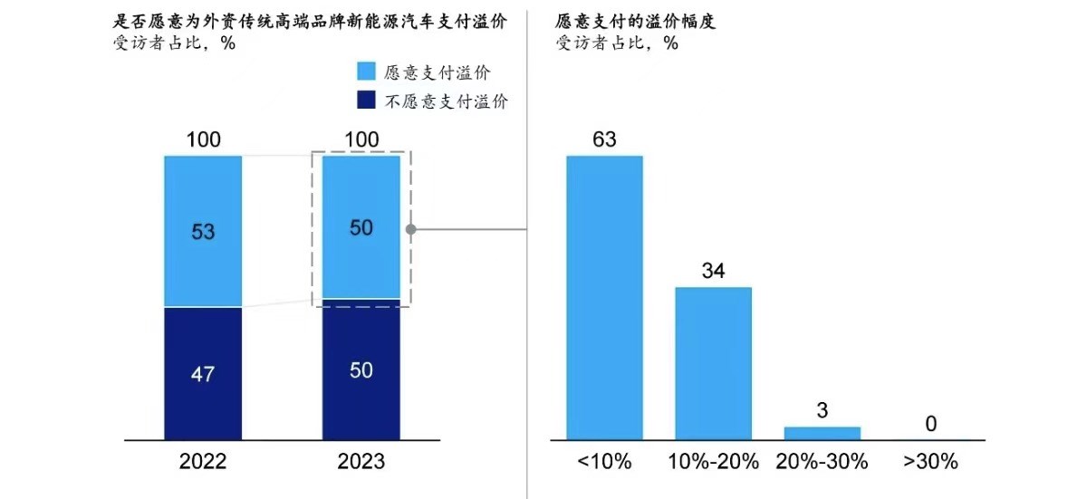 在《2024麥肯錫中國汽車消費(fèi)者洞察》中顯示,50%的受訪者不愿意為外資品牌支付溢價(jià),相比于無形的品牌力,消費(fèi)者現(xiàn)在更愛實(shí)在的技術(shù)與配置。