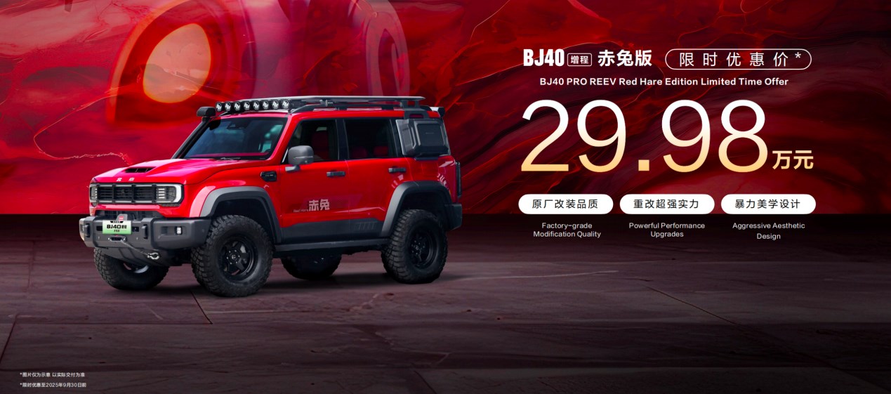 上市以來,BJ40增程進(jìn)階版訂單比例超過75%。北京越野董事長王昊宣布,BJ40增程赤兔版正式發(fā)布,實現(xiàn)顏值、性能、安全三大升級,大幅提升整車視覺沖擊力、越野性能以及安全防護(hù),改裝提升項價值超20萬元,限時優(yōu)惠價為29.98萬元(截止至9月30日),即刻可在“悅野圈APP”下單預(yù)存2000元創(chuàng)始基金,預(yù)計今年四季度正式交付。