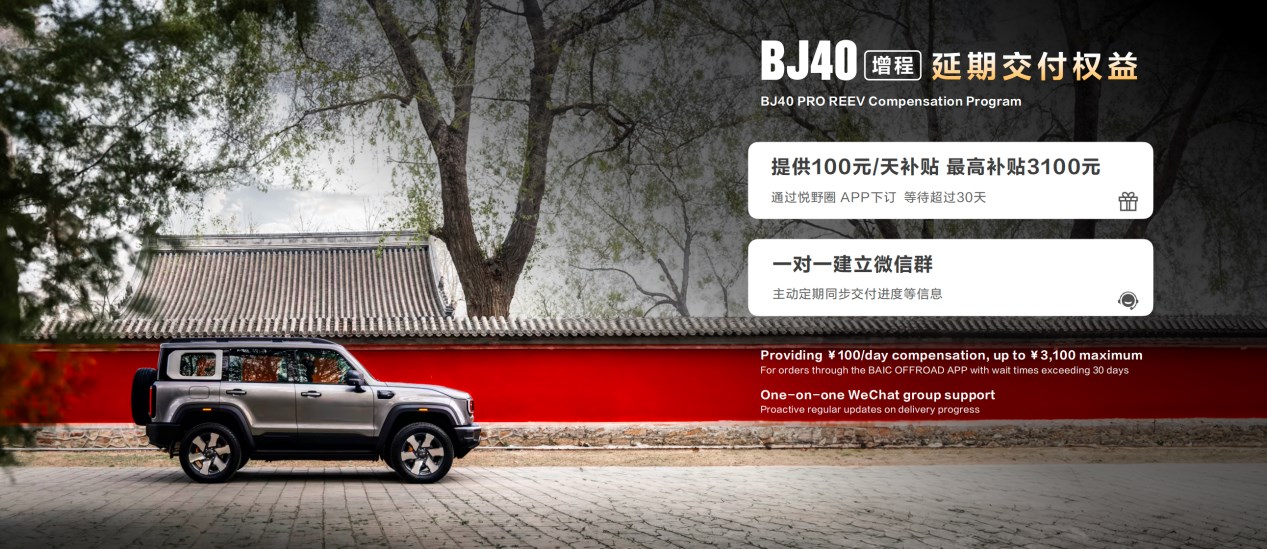 短時間大量訂單涌入,市場上存在部分車輛訂單延遲交付。北京越野發(fā)布“BJ40增程延期交付權(quán)益”,用戶在悅野圈 APP 下訂后,車輛等待時間超過 30 天后給予 100 元/天補貼,最高補貼 3100 元,補貼將在悅野圈 APP 以“積分”形式兌現(xiàn)給用戶。同時,北京越野將與用戶一對一建立微信群,主動定期同步車輛生產(chǎn)下線進(jìn)度、物流發(fā)運進(jìn)度及預(yù)計交車時間等,讓用戶的期待離實現(xiàn)越來越近。