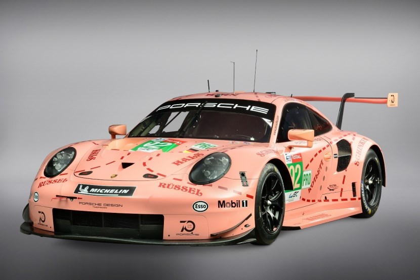 毫無疑問,這是一款現(xiàn)代化的賽車——911 RSR(991),其出征了 2018 年的勒芒 24 小時(shí)耐力賽 GTE-Pro 組別的角逐。最終這臺身披“粉豬”涂裝的 92 號 911 RSR 賽車在與法拉利、寶馬、福特、克爾維特、阿斯頓·馬丁五大制造商車隊(duì)的同場競技中斬獲組別冠軍。更值得一提的是,雖然未出現(xiàn)在展臺,但身披樂富門涂裝的 91 號911 RSR賽車斬獲亞軍,包攬組別前兩名。這款“粉豬”涂裝的 92 號 911 RSR 賽車不由令人想起保時(shí)捷 917/20 賽車征戰(zhàn) 1971 年勒芒比賽時(shí)的情景。車身圖案為粉色豬肉切割圖的樣式,這一由保時(shí)捷設(shè)計(jì)師 Anatole Lapine 提出的設(shè)計(jì)理念在當(dāng)年的法國薩爾特省引起轟動。時(shí)至今日,被稱做“松露獵人”的保時(shí)捷 917/20 賽車仍是最著名的保時(shí)捷賽車之一。