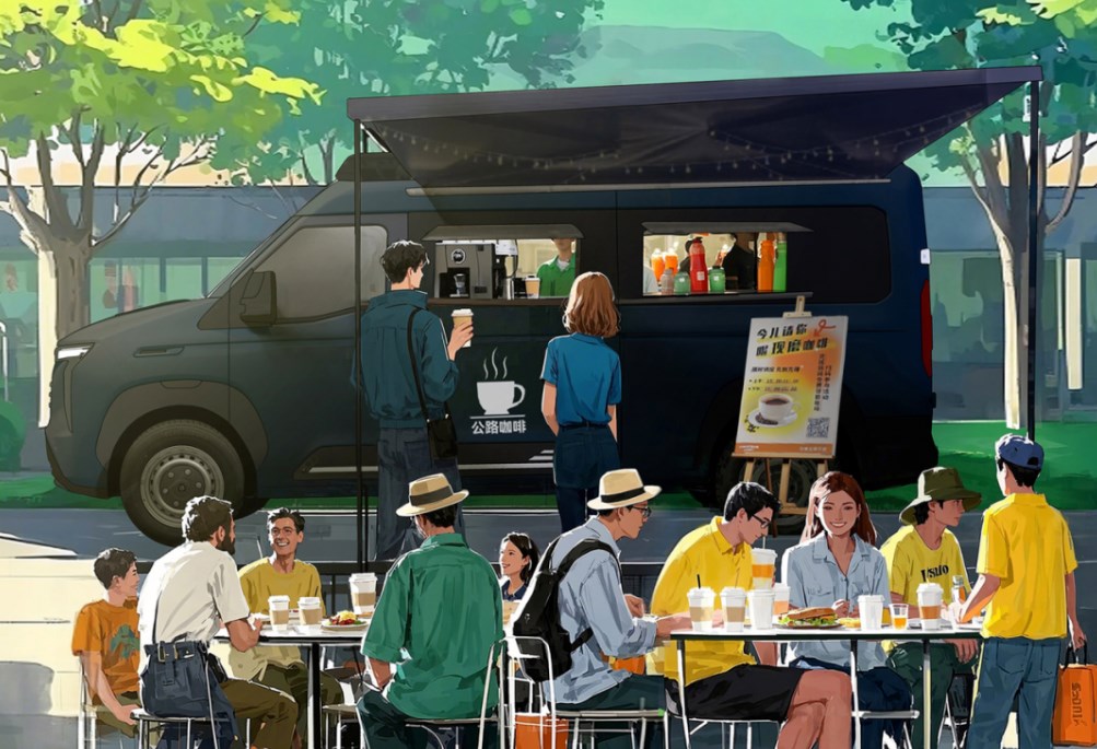 對于咖啡創(chuàng)業(yè)者來說,一輛能靈活穿梭城市角落的移動咖啡館,既是夢想的載體,更是事業(yè)的延伸。先鋒官V的超大空間成為移動吧臺的理想基底,支持搭載咖啡機、微波爐、制冰機、大容量冰箱等專業(yè)設(shè)備,定制化水電系統(tǒng)讓“咖啡館”水電無憂。方正的貨箱設(shè)計帶來 更高的垂直內(nèi)高,咖啡師可在車內(nèi)自如操作,側(cè)邊拓展窗與折疊吧臺組合,瞬間將車廂轉(zhuǎn)化為開放式交互空間。百公里油耗6.77L的高效動力系統(tǒng),讓跨城區(qū)出攤成本可控。先鋒官V用可商用化的改裝方案,讓創(chuàng)業(yè)夢想隨車輪抵達每一個潛在客戶身旁。